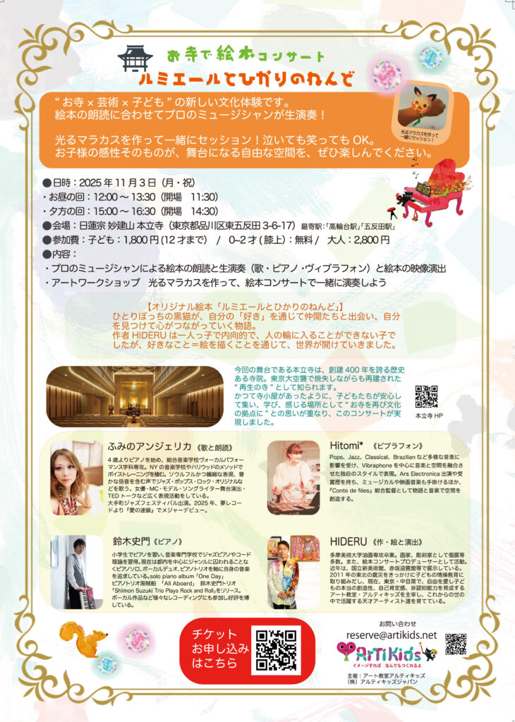 東京都品川区の本立寺にて開催される、子どもたちが音楽とアートに触れる参加型イベントのご案内です。