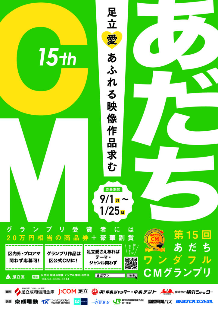足立区の公式CMとして、足立区の魅力や足立区愛が伝わる60秒以内(15秒単位)の動画を募集する。