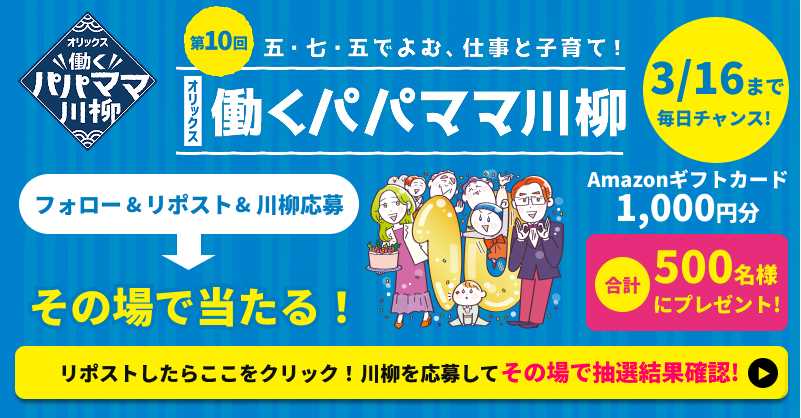 ※ 応募に関する注意事項は、「オリックス 働くパパママ川柳」ウェブサイトをご覧ください。(https://www.orix.co.jp/grp/company/newsroom/senryu/entry/)