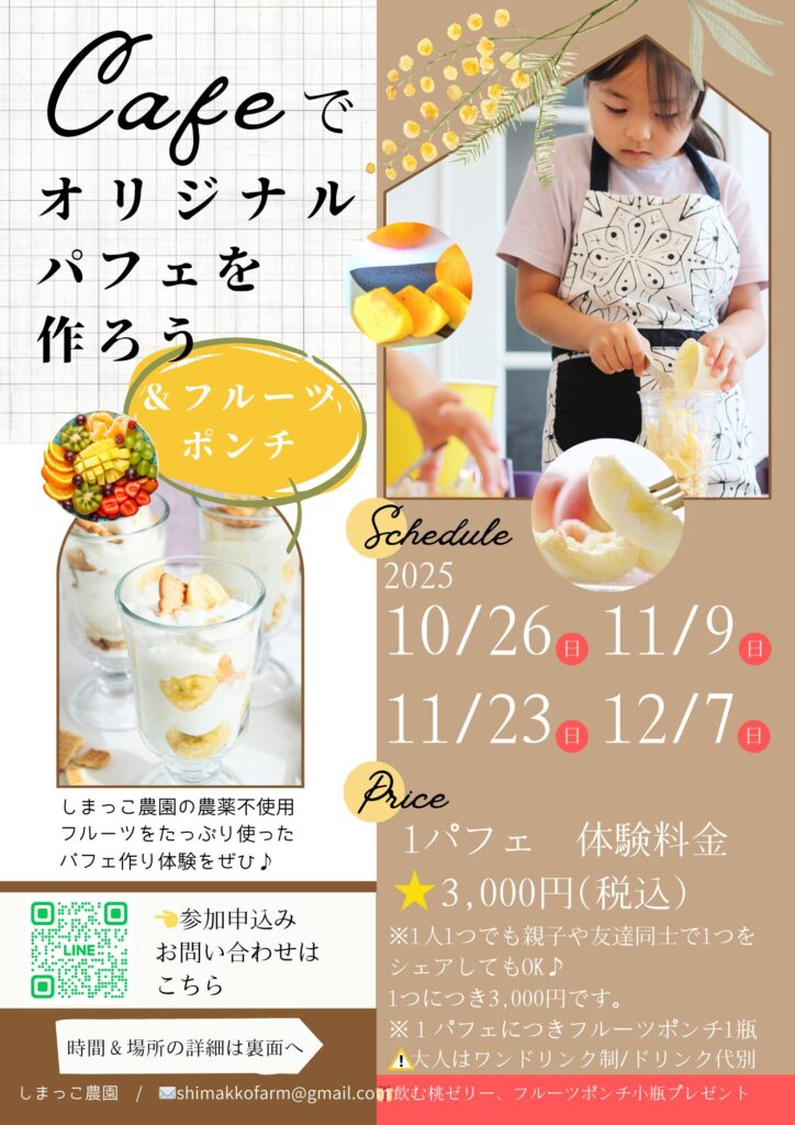 主に桃、柿、はっさくやみかんなどの柑橘類を栽培しています。そんな、しまっこ農園の【ほぼ農薬不使用】桃、柿、ブルーベリーと季節のフルーツをたっぷり使った、パフェ作り体験をお楽しみいただけます♪